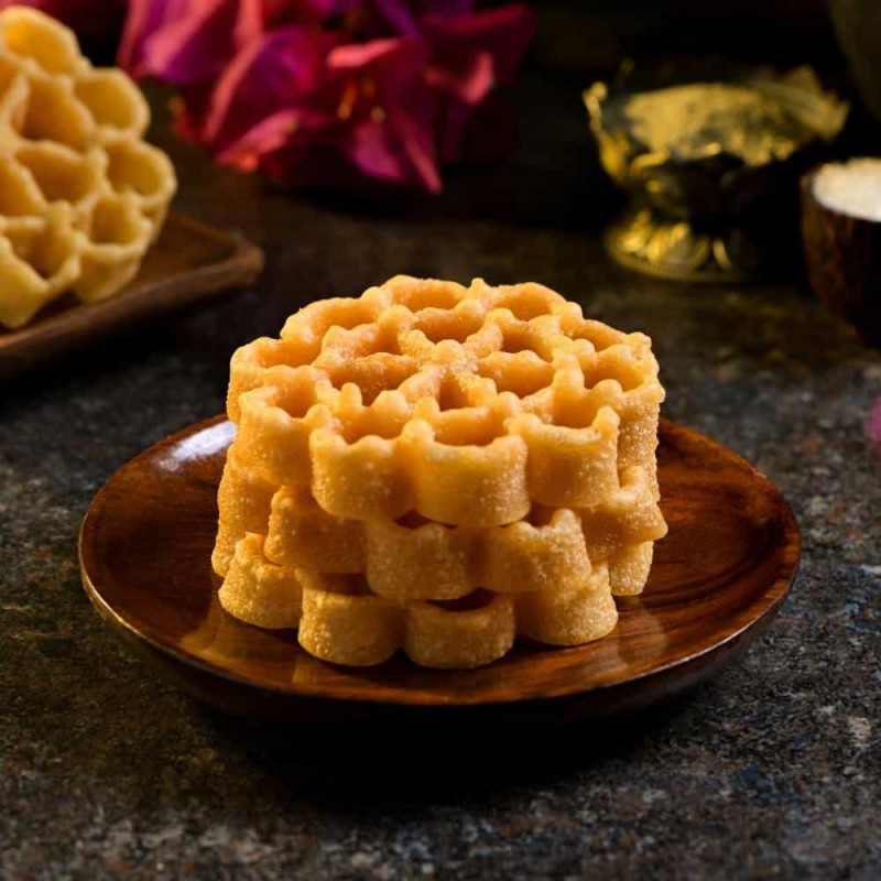 Experience the delicate sweetness of Savithramma's Rose Cakes. Each packet is filled with 5 pieces of these delightful sweets, handcrafted with a blend of rice flour, maida, sugar, and a touch of aromatic cardamom powder. The intricate rose-shaped design adds an elegant touch to these delectable treats. Our skilled artisans take pride in using fresh and locally sourced ingredients to ensure the highest quality and authentic flavors. Whether you want to savor them on your own or share them with loved ones, Savithramma's Rose Cakes are perfect for any occasion. Indulge in the blissful flavors of tradition with every bite of these exquisite sweets.